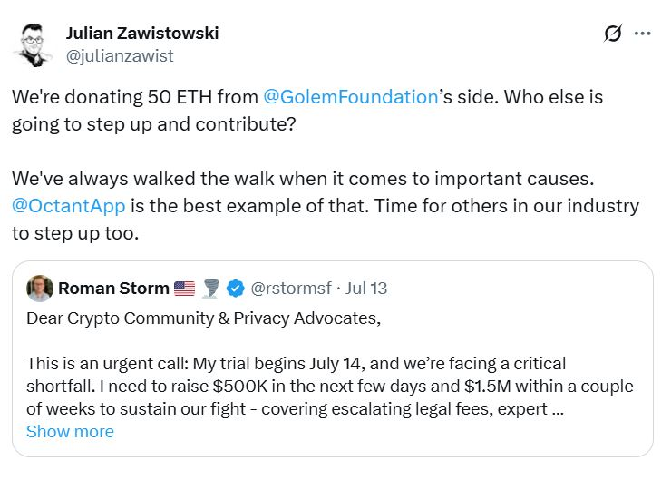 The Ethereum Foundation also pledged to match up to $500,000 in donations to Storm’s defense fund following his conviction.