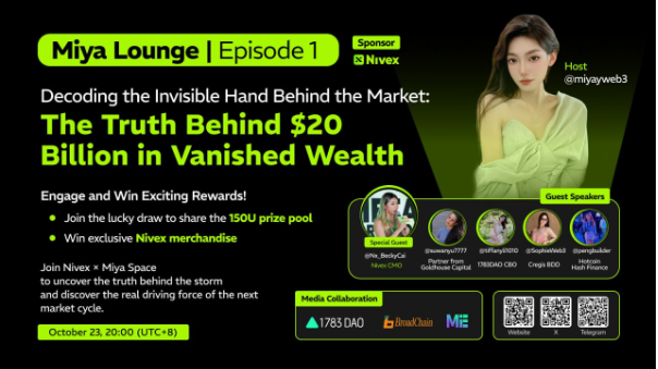 On October 23, the “Miya Lounge” online AMA, proudly sponsored by Nivex, successfully concluded its first episode.The session, themed “Decoding the Invisible Hand Behind the $20B”, brought together guests from Cregis, Hotcoin, Goldhouse Capital, and 1783 DAO, exploring the causes behind the recent $20 billion crypto market crash, the mechanics of fear transmission, and how trust can be rebuilt in the next market cycle.