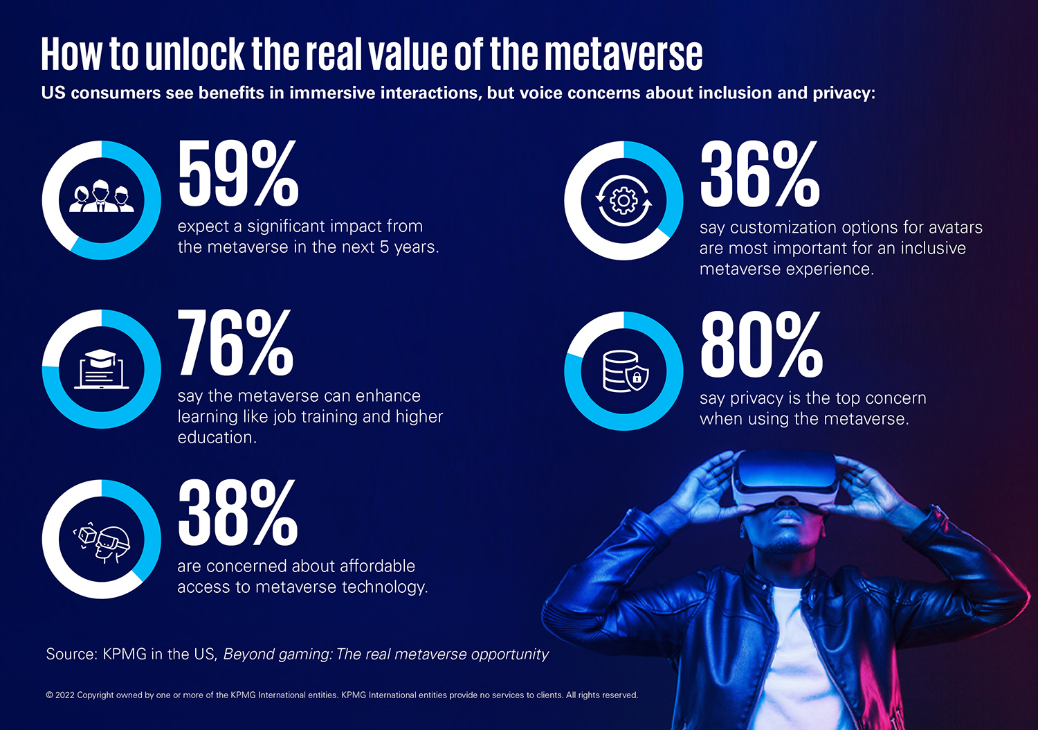 It will be increasingly critical to address and alleviate concerns around privacy and information protection. Privacy and protecting personal information were the most significant concerns among US consumers, at 80% and 79% respectively. It’s important to make sure everyone feels secure to encourage participation. What’s more, industry leaders know that security, compliance and regulatory issues are among the biggest challenges in trying to deploy or build technologies, applications or experiences related to the metaverse.