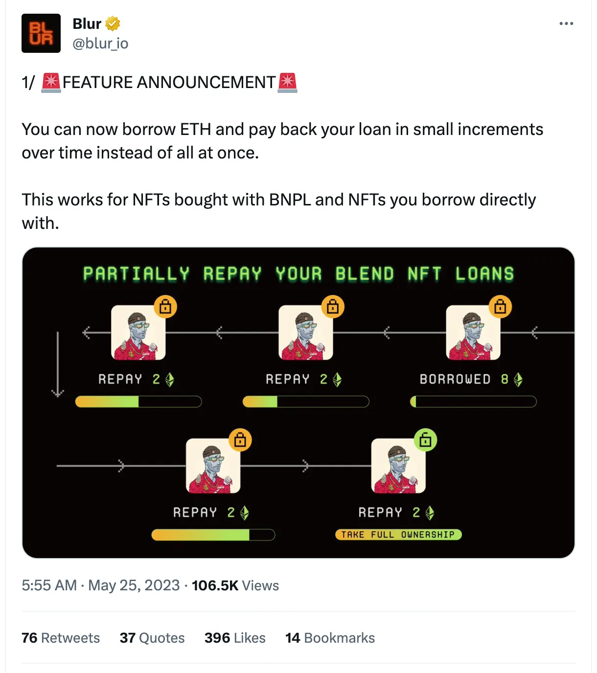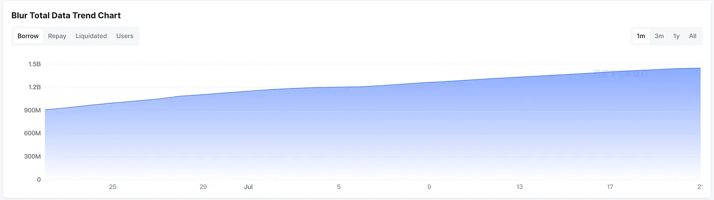 NFT marketplace Blur.io launched its peer-to-peer NFT lending platform, aptly named Blend, on May 1. In just one month, according to NFTScan data, the platform facilitated over $1.4 billion in loans (58.33% of loan volume in the whole ecosystem), significantly outpacing its closest competitor, NFTfi, which has an all-time loan volume of about $470 million.