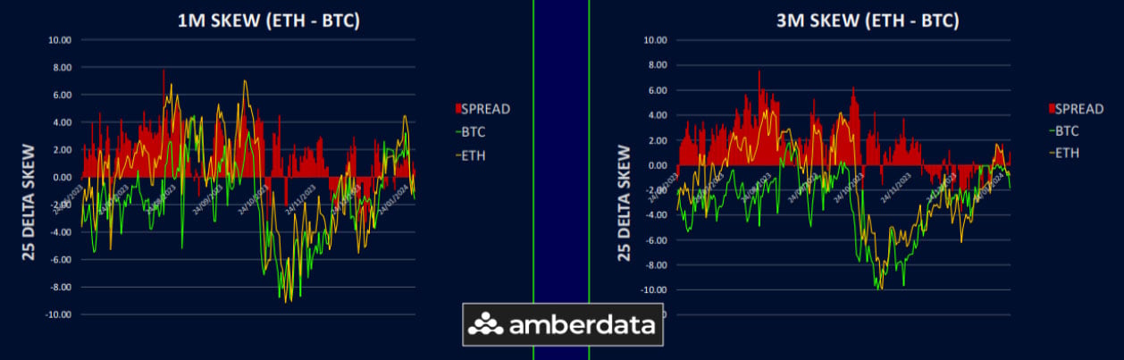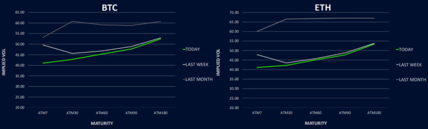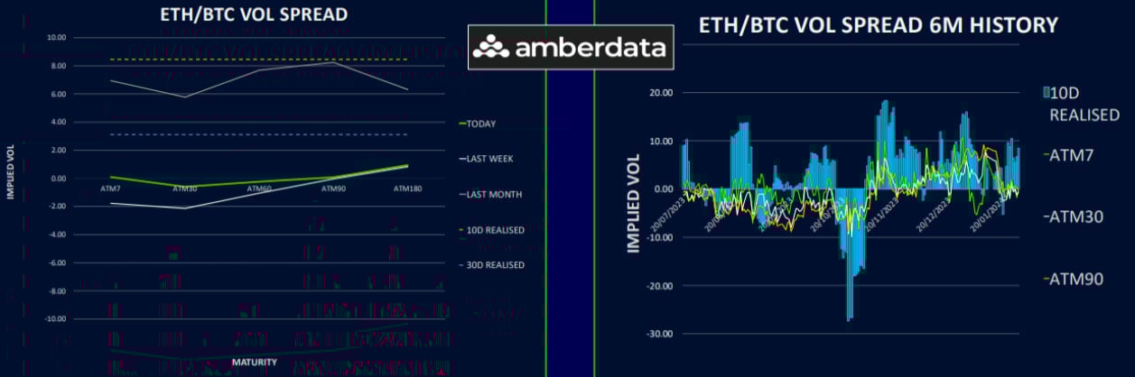 Ethereum shows a similar move but with a more modest 1 vol call premium for up to 3-month expiries as the bullish ETH narrative seems to be getting pushed out in time.