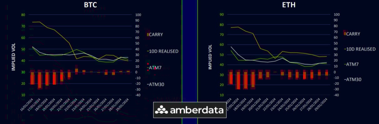 Dealer gamma positioning in Bitcoin has neutralized after large 26Jan 42k short strikes expires and fresh sellers of 23Feb options came in last week. Meanwhile, Ethereum’s gamma positioning has significantly increased, indicating a potential challenge for major movements without significant news.