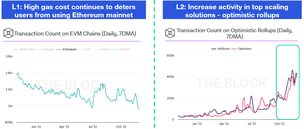 When looking at web3 transaction activity, rollups continue to scale Ethereum at an astonishing rate. Less transactions have been done on Ethereum (left chart) and more on top scaling solutions such as Arbitrum and Optimism (right chart). Layer 2’s continue to gain adoption due to a reduction in transaction costs, security from Layer 1 Ethereum and its expansion into the broader crypto-ecosystem such as the NFTs. Example, NFT Marketplace Opensea launched support for Arbitrum-based NFTs.