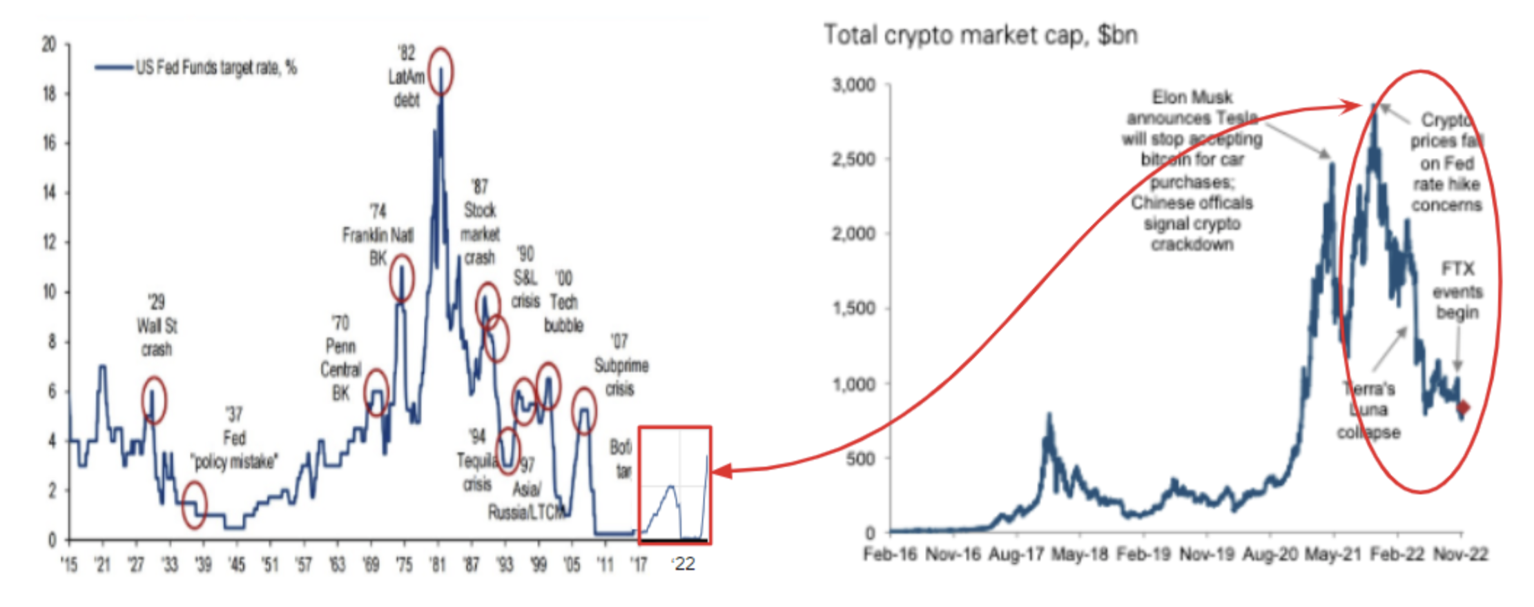 Historically, when the US Federal Reserve (Fed) begins tightening, it exposes asset classes where excessive leverage has built up. In 2000 it exposed technology companies (the Tech bubble), in 2007 it exposed subprime lending (mortgage-backed securities), and in this cycle it exposed crypto. Comparing the timeline of current Fed hikes with the total crypto market cap shows the decline in line with increased interest rates. This is to say that monetary policy plays a crucial role in sector performance.