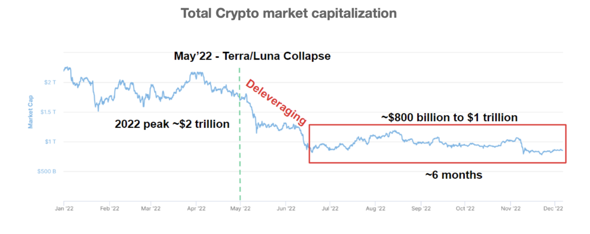 We find that the majority of leverage in crypto markets has been flushed out following the collapse of Terra/Luna and Three Arrows Capital. The crypto market cap has declined from a peak of $2T in 2022 to a current level between $800B-$1T. Crypto has been trading largely range bound in the last six months despite the high-profile collapse of FTX.