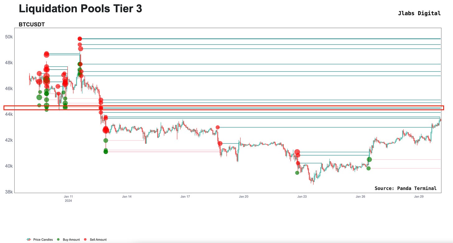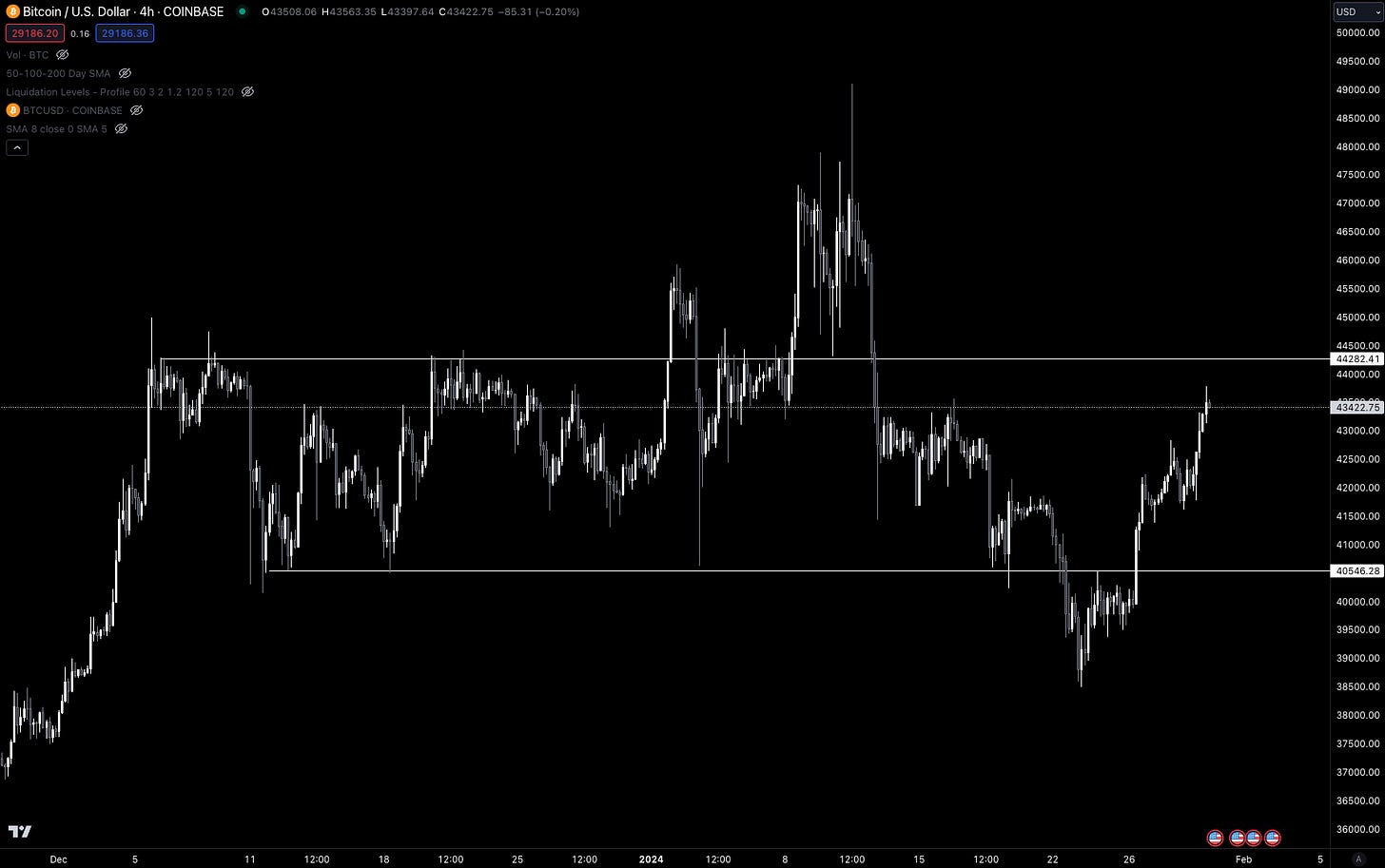 To get an idea, here is a liquidation pool chart. This highlights where price might go as it is attracted to liquidity. There’s a nice batch sitting at $44.4k. Based on the chart prior, I would expect to see price attempt to grab that liquidity in the ours surrounding the New York open on January 31.