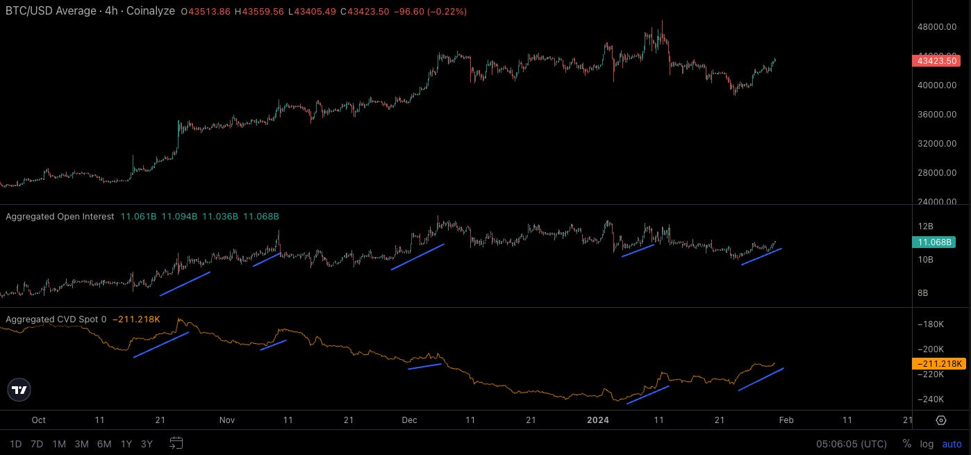 I’ve added an upward sloping blue line to the areas where the two are trending higher in tandem. The chart shows BTC/USD, open interest, and CVD spot from top, down.