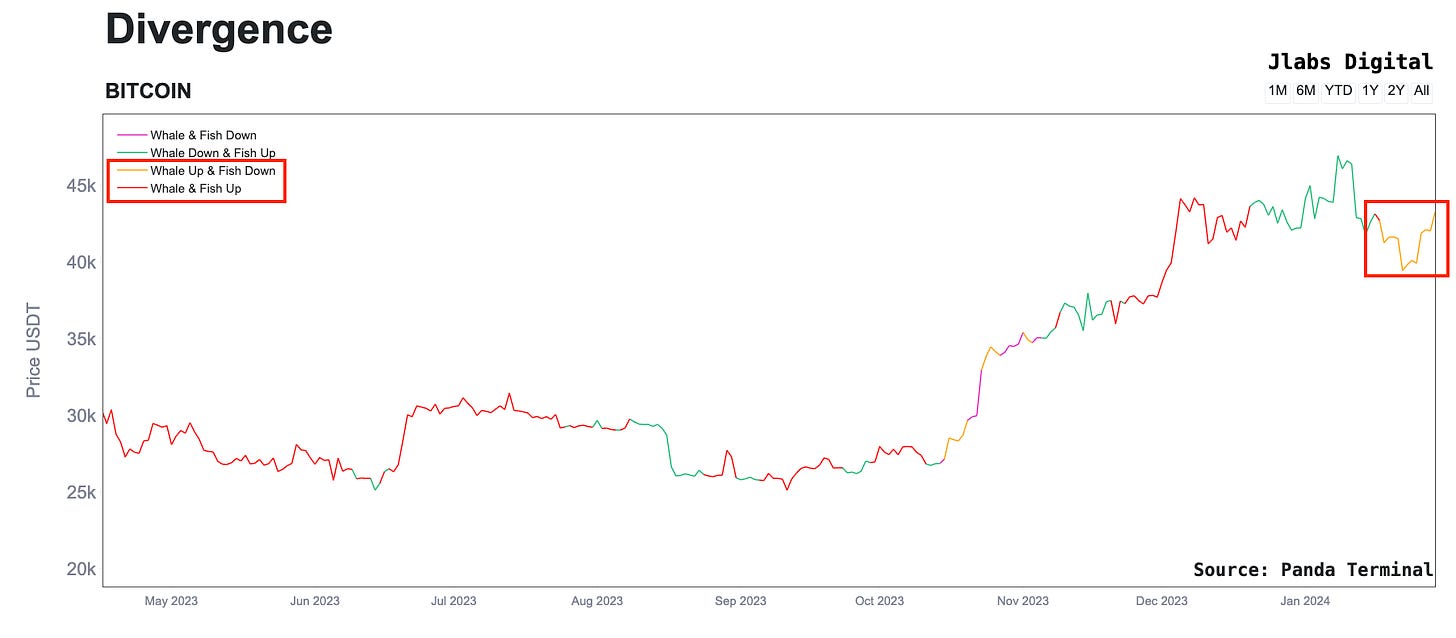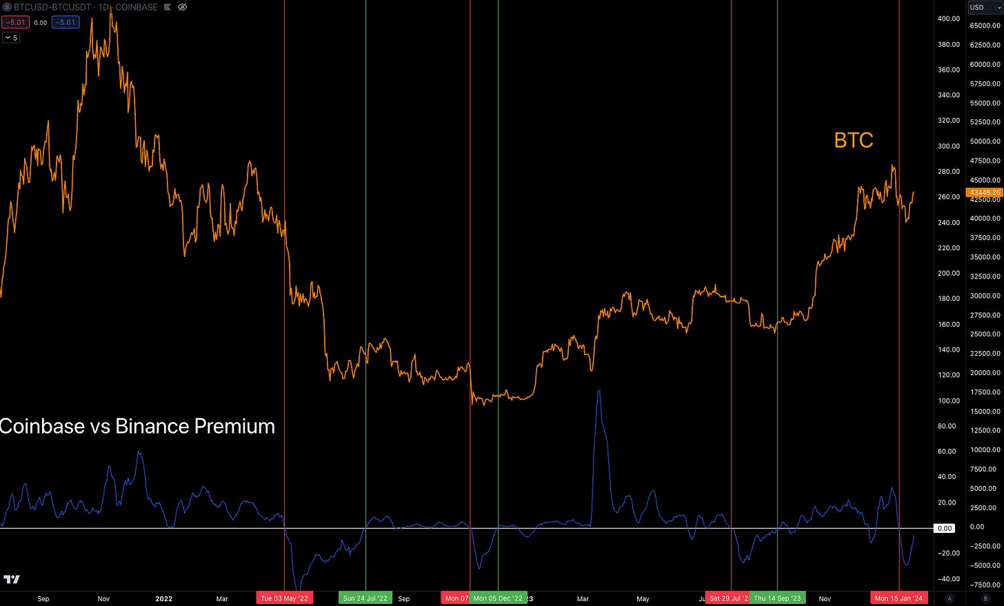 The main stat I’ve been keeping my eye on during this post-ETF Bitcoin world is the spread between Coinbase and Binance. This has been negative for the most part since the approval, and tends to be correlated with negative price action.