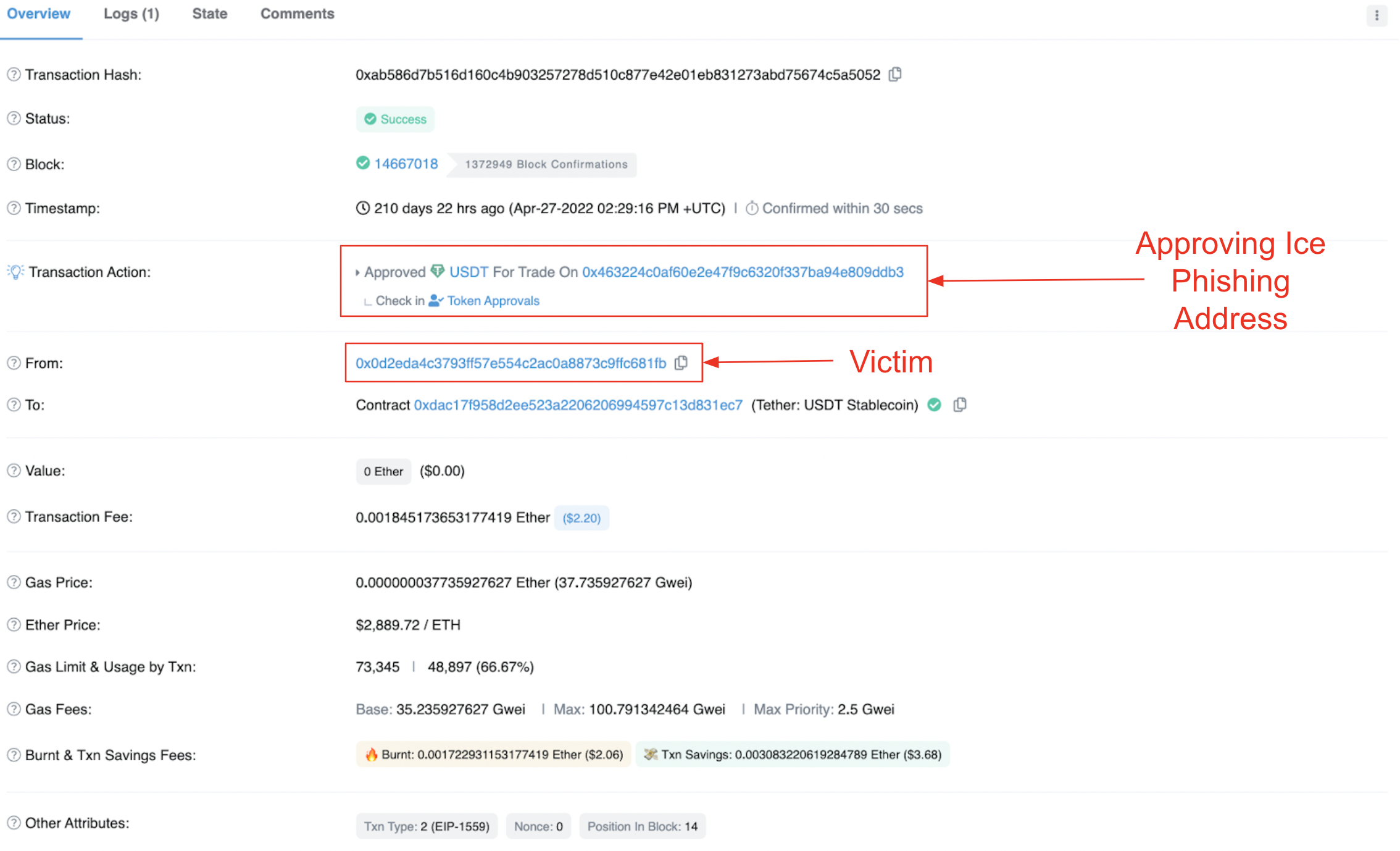 The first stage of an ice phishing attack occurs when the victim is tricked into approving an EOA or a malicious contract to spend tokens from the victim's wallet. We can see an example of this in the below transaction: