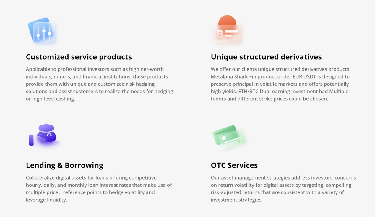 Metalpha offers unique structured derivatives to its clients. For example, Metalpha's European-style U-primary Shark Fin product is designed to protect against market volatility by preserving principal and also offers potentially high returns. the ETH/BTC Double Win investment product is available with a variety of maturities and different strike prices.