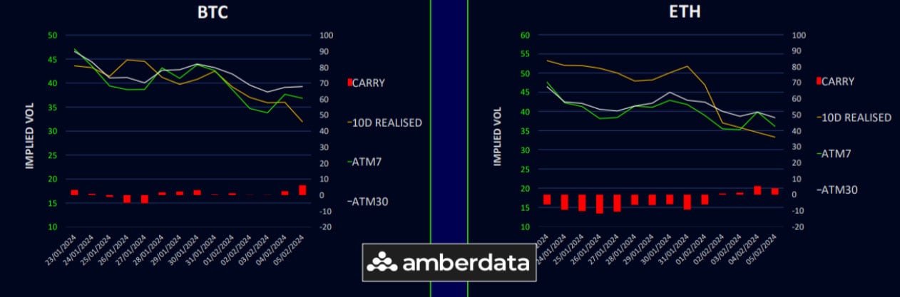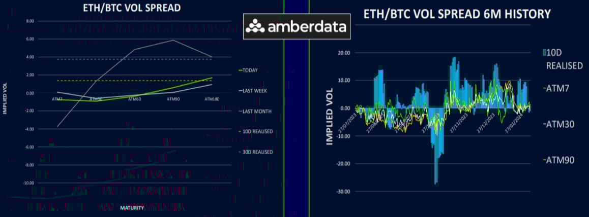 Ethereum’s term structure is also steepening with lower front-end volatility. Implied volatilities are fast approaching their lows as excitement over ETFs wanes and the market finds equilibrium.
