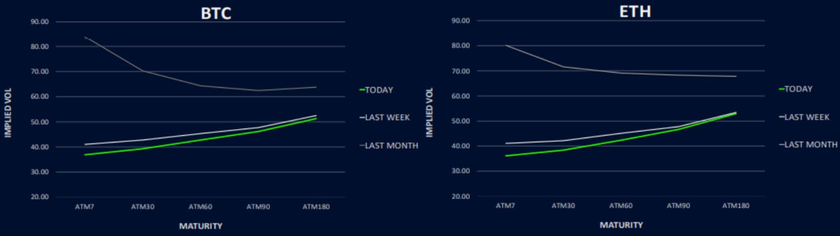 Hence, trading calendar spread switches between the two could be a sensible move. Another way of thinking about this is saying you want to own the ‘forward’ vol spread ETH/BTC which is a VEGA trade, rather than spot starting, which has GAMMA (realized vol) exposure.