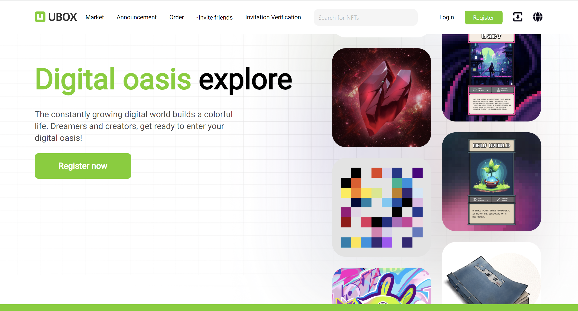 Ubox's core concept is to "build your digital oasis", providing users with a wide range of digital assets and a new interactive experience for collecting. It breaks the monotony of traditional trading platforms by building a broader trading scene around the NFT ecosystem, including easy trading, exciting collectibles, more interactive experiences, immersive communities and scene empowerment.