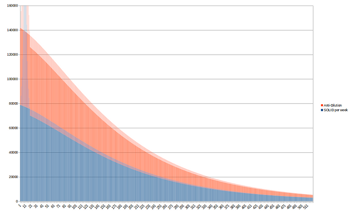 As we know from before, ve(3,3) emissions get distributed to liquidity providers. Emissions are newly issued tokens hence the total supply increases with emissions. To support long-term believers of the ve(3,3) DEX who lock their tokens, their position doesn’t get hurt by the token’s inflation. So they, in turn, earn a respective amount to hold their current position (if a locker had 1% of the total supply when first locking their tokens, they would still own 1% of the total supply in the future). Also, with a higher percentage of supply locked, rebase increases and dilution decreases. So, if you just hold the native token and do not lock it, you will be diluted by LP emissions. This incentivizes you to lock your tokens. To visualize, if 100% of the tokens are locked, all new emissions go to token lockers and the below graph will be all orange with no blue. This graph shows how emissions are distributed. (blue = emissions to LPers | orange = emissions to lockers):