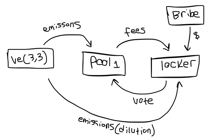 As a result, token pairs with a bribe will have a higher APR than without one. We know that lockers will vote for the token pair with the highest APR to maximize their rewards. So, bribing will increase the number of votes that a token pair gets, which as mentioned before increases liquidity, … etc. The currency that lockers receive from bribes is decided by the bribe issuer. They can be paid out in either the ve(3,3) DEX’s native token or the bribe issuer’s native token. ($VELO or $SONNE respectively in an example of Velodrome being the ve(3,3) DEX and Sonne Finance being the bribe issuer)