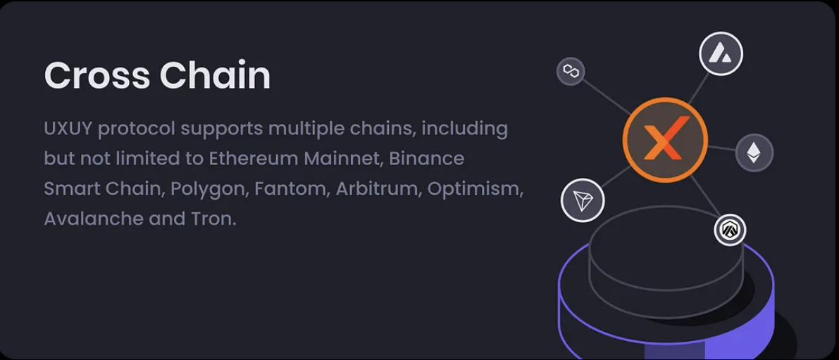 UXUY supports multiple chains, including but not limited to Ether mainnet, Coinan Smartchain, Polygon, Fantom, Arbitrum, Optimism, Avalanche and Wavefield. This multi-chain support allows users to trade across different master chains, access a wider selection of assets, and share in the explosive growth of decentralized finance.